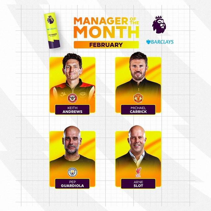 北京时间3月5日,英超官方公布了2月最佳主帅的候选名单,其中安德鲁斯、卡里克、瓜迪奥拉和斯洛特在列。