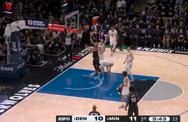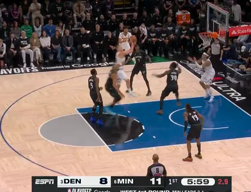 第一节比赛中,约基奇行进间抛投打进得到8分,戈贝尔晃飞防守轻松上篮回应。