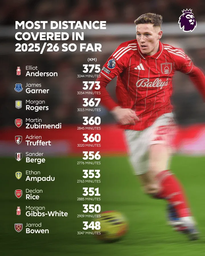 诺丁汉森林队的全能中场球员埃利奥特-安德森是2025/26赛季至今所有英超球员中跑动距离最长的。