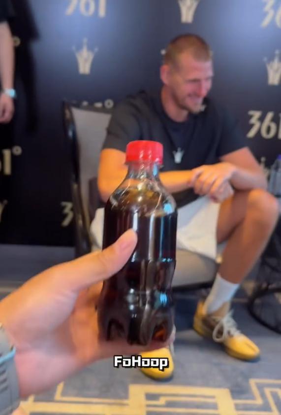 在广东活动的时间段,有热情的中国球迷给约基奇送出“快乐水”。